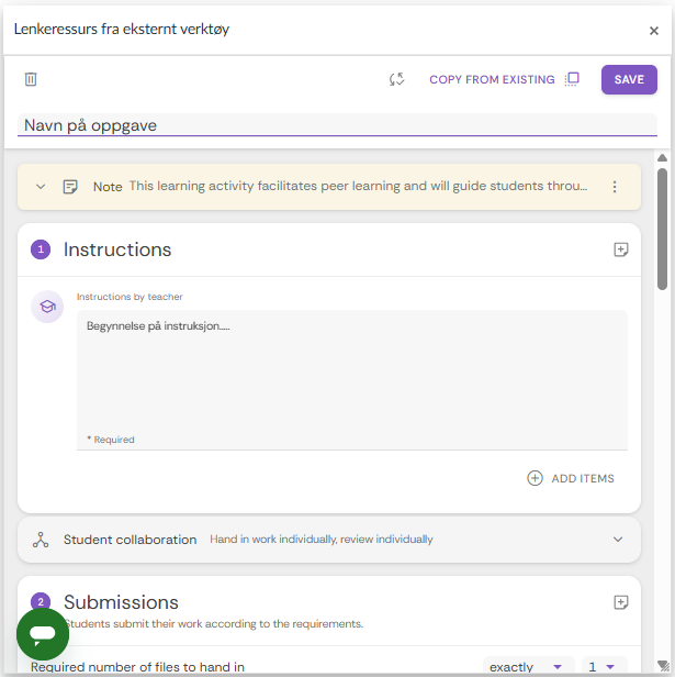 - Du m? gi oppgaven et navn i FeedbackFruits, og m? legge inn noe tekst i instruksjonen f?r du f?r lagret